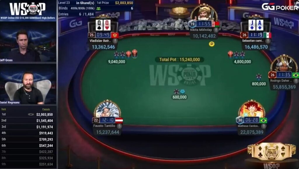“إذا كانت نطاقات المزايدة الرباعية كما ينبغي أن تكون، فإن يد (آس-جاك) في ورطة كبيرة”، قال دانيال نيغريانو (2:02:25)، حيث أخذ سيباستيان هيناو وقته قبل أن يقوم بدفع مؤلم. تم استدعاؤه فورًا بواسطة الروسي فلاديسلاف باتراكوف بجيب الملكات، حيث بدا الفلوب في البداية وكأنه أنقذ هيناو، حيث جاء J-J-9، ولكن مع وجود ورقتين سبيد على الفلوب وواحدة أخرى على الدور، كان لدى باتراكوف 22% من الأوراق ليأتي ويضرب سبيد رابع ليذهب رانر-رانر للحصول على وعاء مذهل بقيمة 43 مليون رقاقة.
