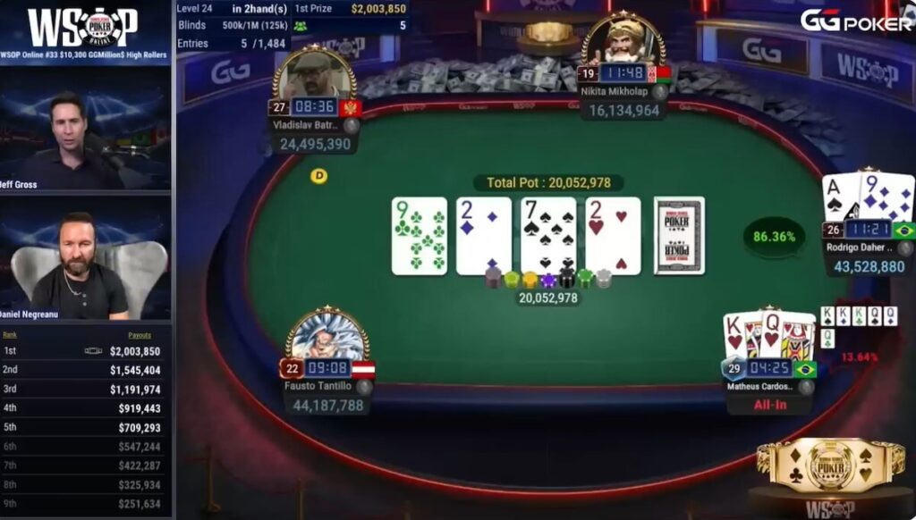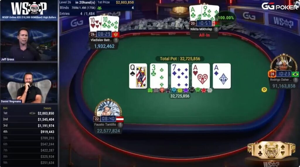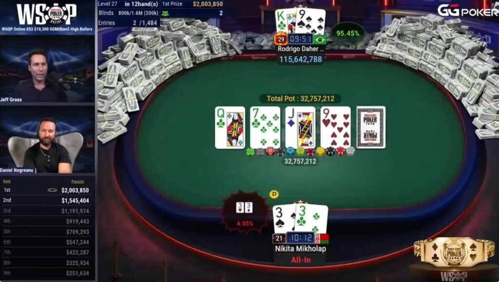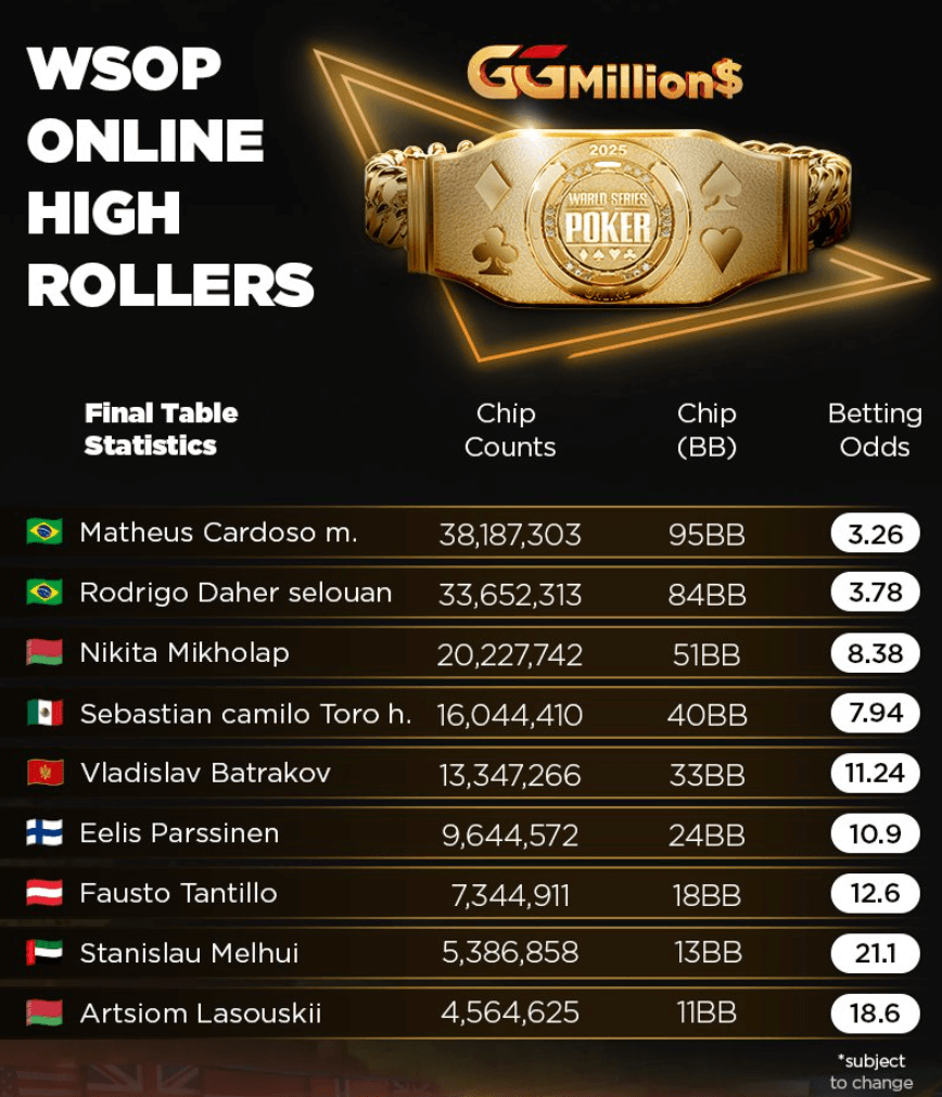 من بين المتأهلين التسعة إلى الطاولة النهائية في حدث WSOP Online رقم 33، كان من المرجح أن يكون البطل برازيليًا أكثر من بيلاروسي. ومع ذلك، من بين البرازيليين الاثنين، كانت فرص رودريغو سيلووان تبدو أفضل، رغم أنه بدأ اللعب متأخرًا بـ11 رقاقة كبيرة عن مواطنه.