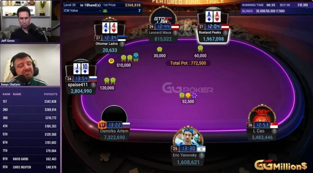 Across a thrilling three-hour final table, things initially went how you’d have imagined as kick-off pre-empted short stacks being eliminated by the more powerful players around them. Nguyen left in ninth for $48,976 after losing a flip to Osmirko Artem, ace-jack no good against pocket sixes, especially after a third six landed on the flop. Nguyen would be joined soon after on the virtual rail by Ravid Garbi, Israel’s finest at the GGMillion$ felt, going down with pocket jacks against the ace-king of Long Cao to walk away with $62,463 in eighth after an ace arrived on the turn.