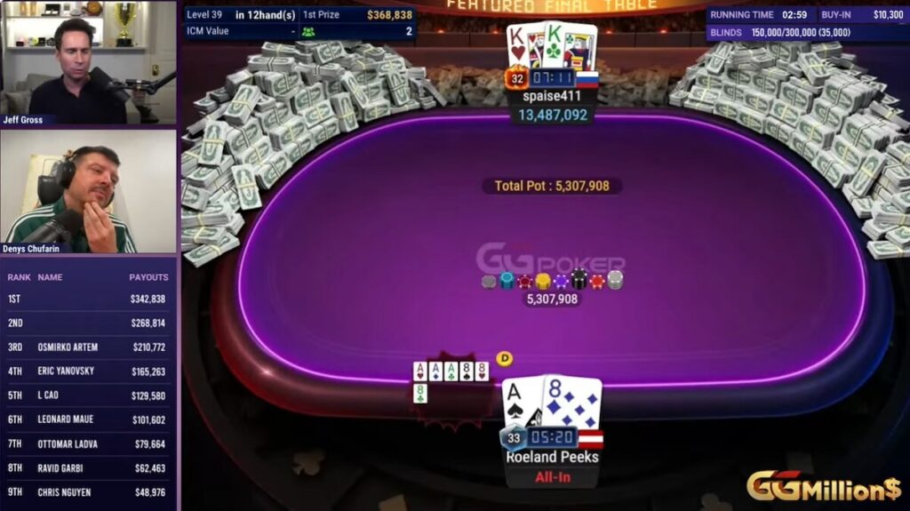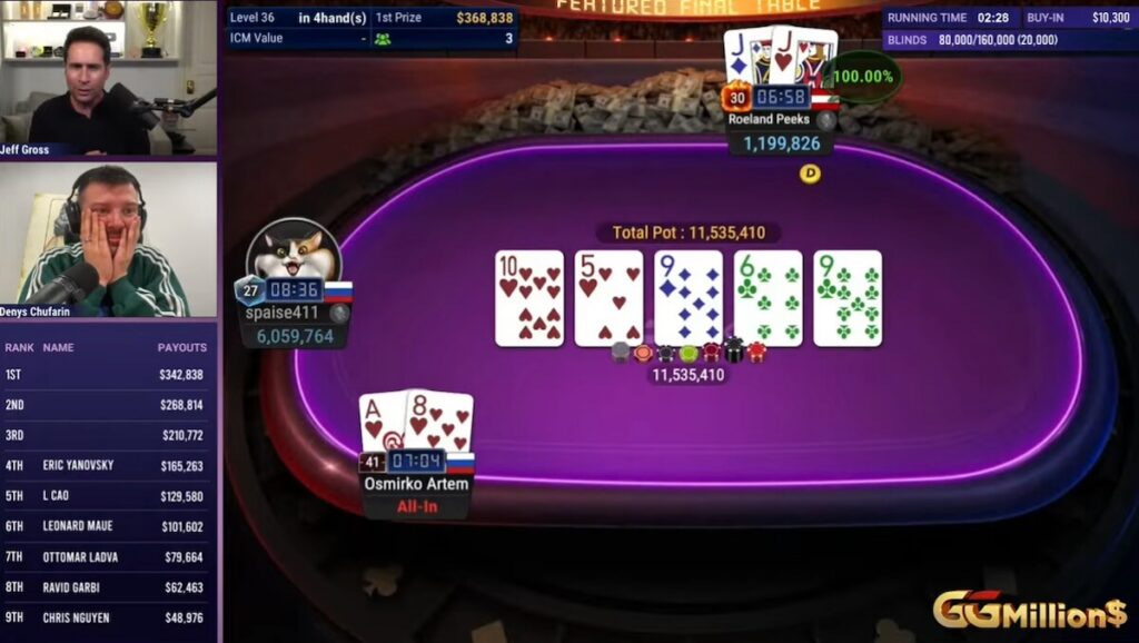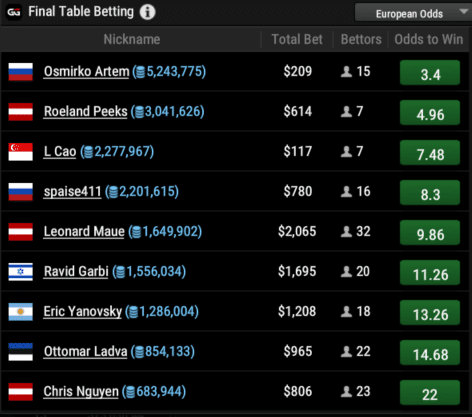 Heading into the final table of nine, the leader was the Russian player Osmirko Artem, who bounced into the action on a super-sized stack of 105 big blinds. Having accumulated 27.9% of the chips in play, he was unsurprisingly a massive favorite to land the title, with odds of just 3.5 going into the final. Closest to Artem in terms of chips – and betting odds on GGPoker – was the Dutch player Roeland Peeks on 61 big blinds, which was reflected with odds of 5.1.