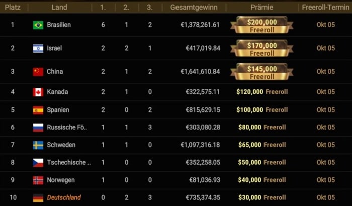 Mit zweimal Silber und dreimal Bronze liegt Deutschland im Medaillenspiegel aktuell auf Platz zehn und ist damit die einzige Nation ohne Bracelet in den Top 10. Mit einem Sieg würde es hoch gehen auf Platz 6, sollte aber eine zehnte Nation vor Deutschland ein Bracelet holen, wären die Freerolls in Gefahr. Kaum mehr einzuholen ist Brasilien mit mittlerweile sechs Bracelets. Das sind jetzt schon zwei mehr als Deutschland letztes Jahr für den Sieg benötigt hatte.